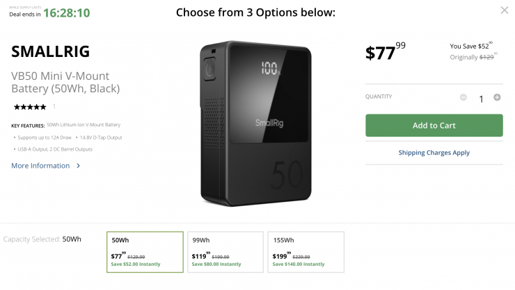 The SmallRig VB50/VB99/VB155 Mini V-Mount Batteries are on sale and you can save $52, $80, and $140 USD respectively.