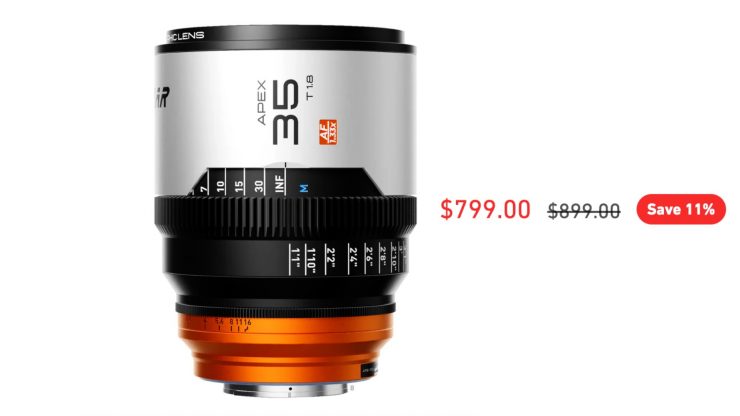 The Blazar Lens APEX 35MM T1.8 AF 1.33X Anamorphic (E Mount) is available for $799 USD. The Apex 1.33x T1.8 AF features a focus-by-wire system for seamless switching between autofocus and manual focus. Designed to work with an APS-C sensor.
