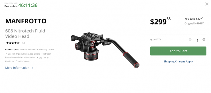 The Manfrotto 608 Nitrotech Fluid Video Head is on sale for $299.88 USD, which is a big discount of $307 USD.