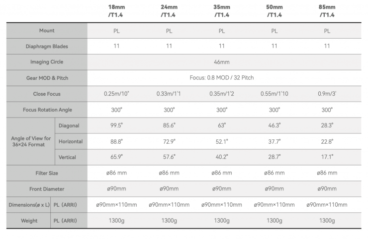 The series is available in PL mount, with flange distances from 16.1mm to 19.8mm, ensuring compatibility with most PL-mount cameras and adapters.