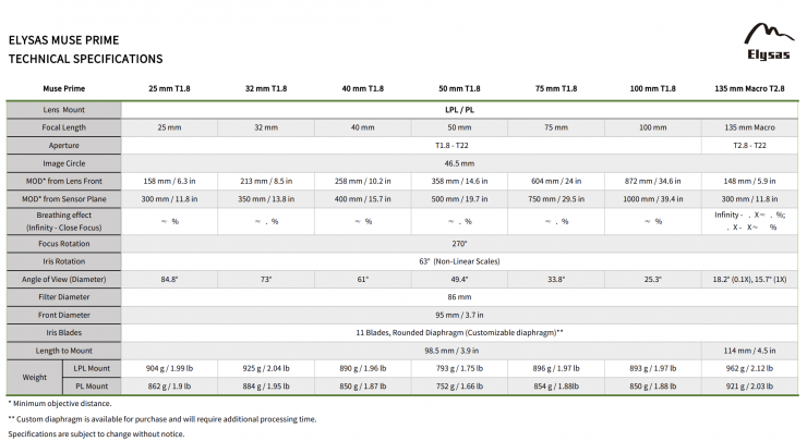 - Engineering challenges have been overcome to reduce the cost of high-quality cine lenses, allowing ELYSAS to offer the Muse Primes at a competitive price.