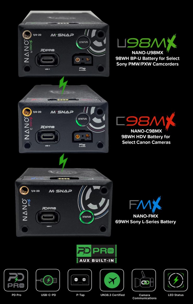 - M-Snap: As part of the cutting-edge Nano M-Snap Series, the NANO-C98MX introduces magnetic snap-charge technology, enabling seamless stacking and charging through a single PDPro USBCPD connection—no matter the mount or voltage type. With advanced outputs, robust capacity, and a feature-packed design, this battery goes beyond traditional expectations to meet the demands of professional shooters.