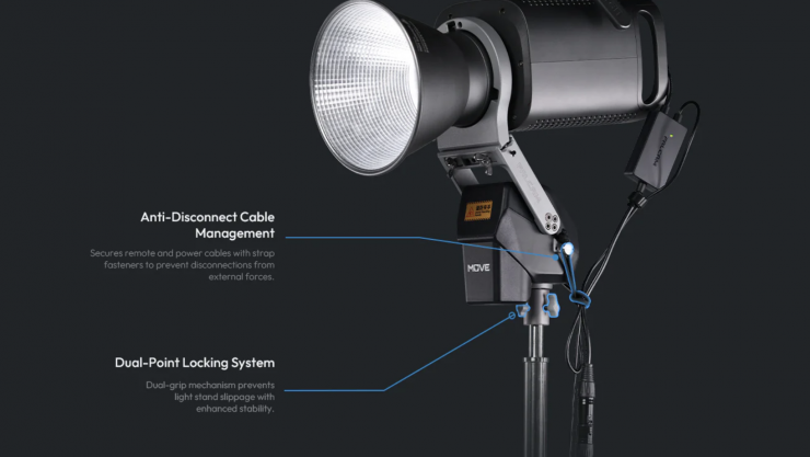 The Move LightGo offers 170° of tilt and 450° panning, and it allows you to control the position of your light via the included wired remote, the mobile app, or a separately available wireless remote.