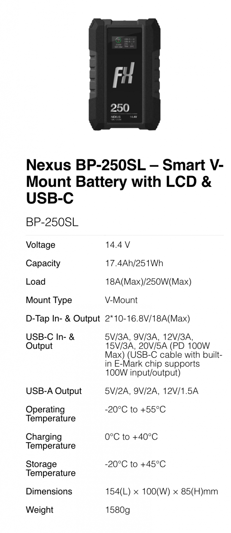 The Nexus BP-250SL is a V-Mount battery with a capacity of 14.4V / 17.4Ah / 251Wh and a maximum output of 14.4V / 18A. It features two D-Tap in/out ports, one USB-C port supporting up to 100W input/output, and one USB-A output port. Equipped with an intelligent PCB, the battery communicates with SONY and RED cameras.