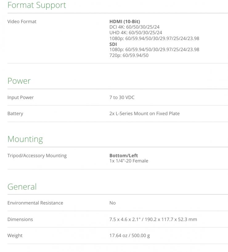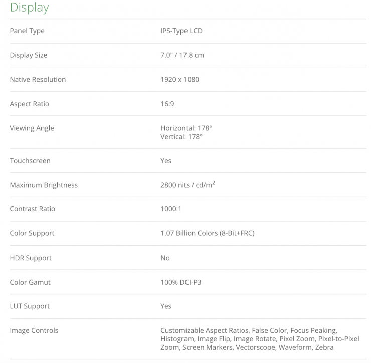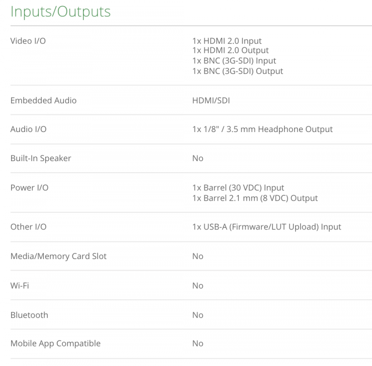 Features include a viewing angle of 178°, HDMI 2.0 and 3G-SDI input and outputs, LUT import via the USB-A port, a 3.5mm headphone output, and support for up to DCI 4K60 HDMI video input and output with embedded audio.