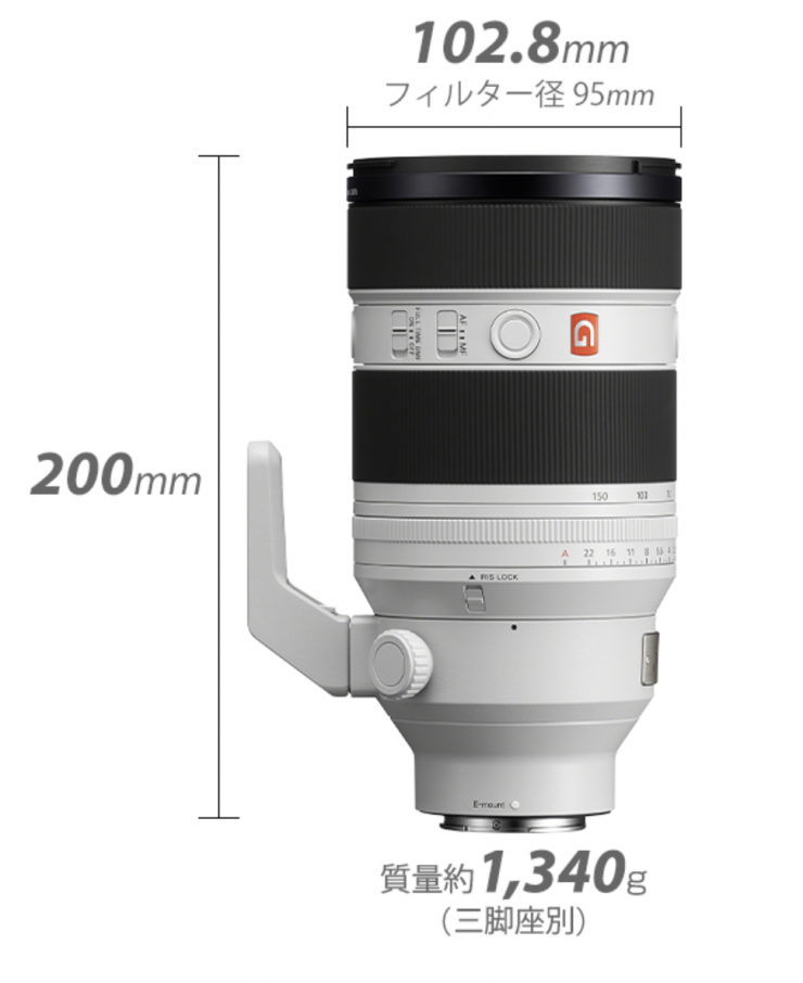 The lens weighs 1340g (excluding tripod mount). The front filter diameter is 95mm.