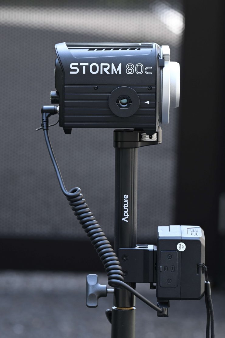 By attaching a battery, you can power it remotely and either have someone hold it or place it directly on a light stand. You would also need to purchase the Aputure D-Tap to Locking 5.5mm DC Barrel Power Cable for STORM 80c ($10 USD) to run it via. battery remotely.