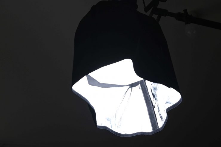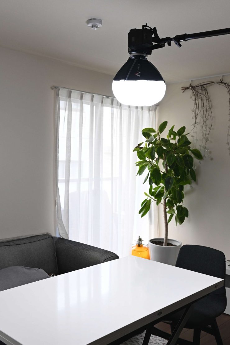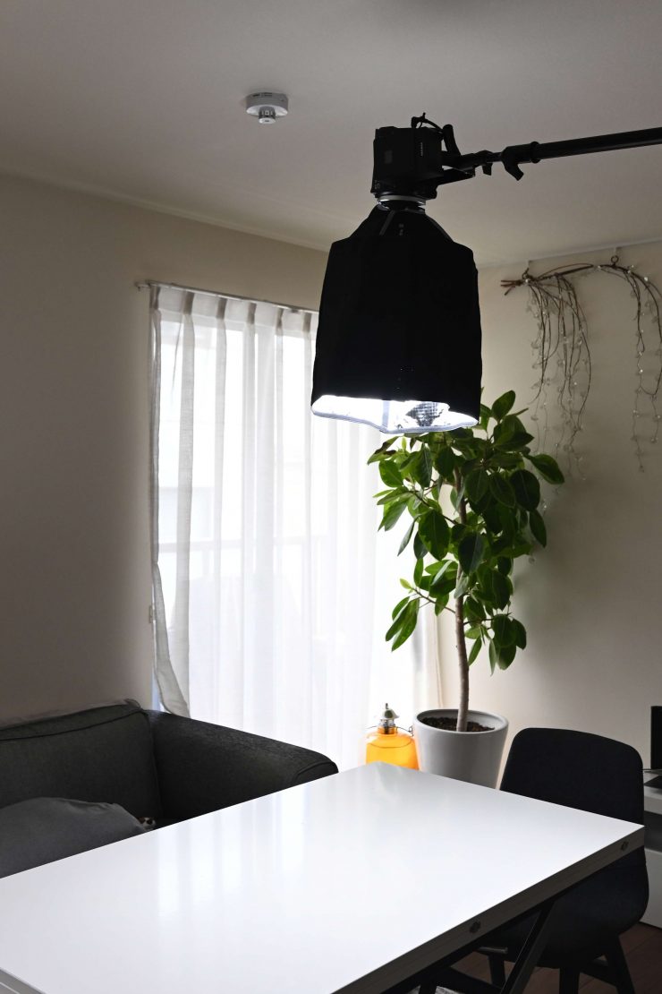 Above you can see some photos I took where I placed the light on a boom arm above a table and used it with its Hyper reflector, and the optional Lantern. Because the STORM 80c doesn’t weigh much it is easy to rig in this way and it works well if you need to put some overhead light down onto a table.