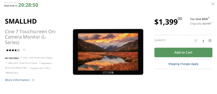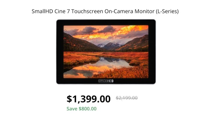 The SmallHD Cine 7 Touchscreen On-Camera Monitor (L-Series) is on sale for $1,399 USD, which is a saving of $800 USD.