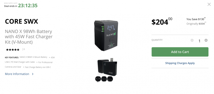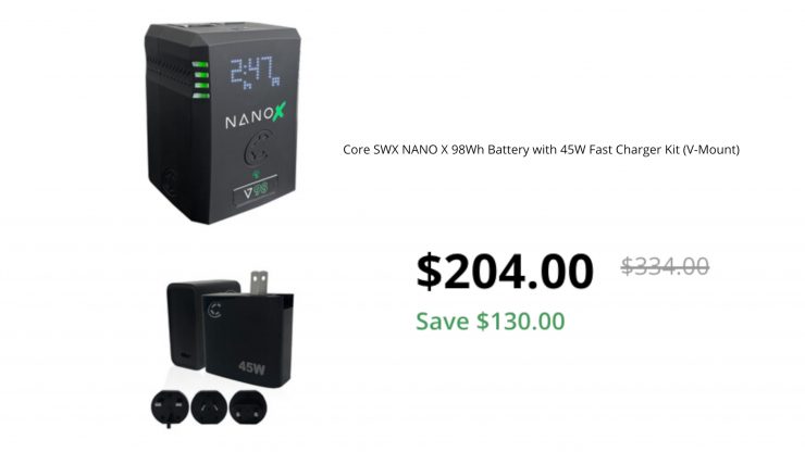 The Core SWX NANO X 98Wh Battery with 45W Fast Charger Kit (V-Mount) is on sale for $204 USD, which is a discount of $130 USD.