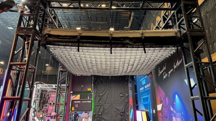 At Cine Gear 2025 in Los Angeles, Godox was showing a prototype of its yet-to-be-released AM1600R. The AM1600R is a giant 8′ x 8′ flexible RGBWW flexible panel light with an inflatable softbox.