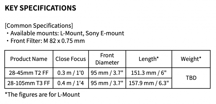 The Sigma 28-45mm T2 FF will be available in November 2025, and the Sigma 28-105mm T3 FF will be available in Spring 2026. The lenses will be available in Sony E and Leica L mounts.