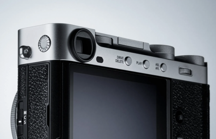 The viewfinder and diopter adjustment control fit flush with the body, while the Bluetooth button on the base plate evokes the look of the rewind button on classic film camera.