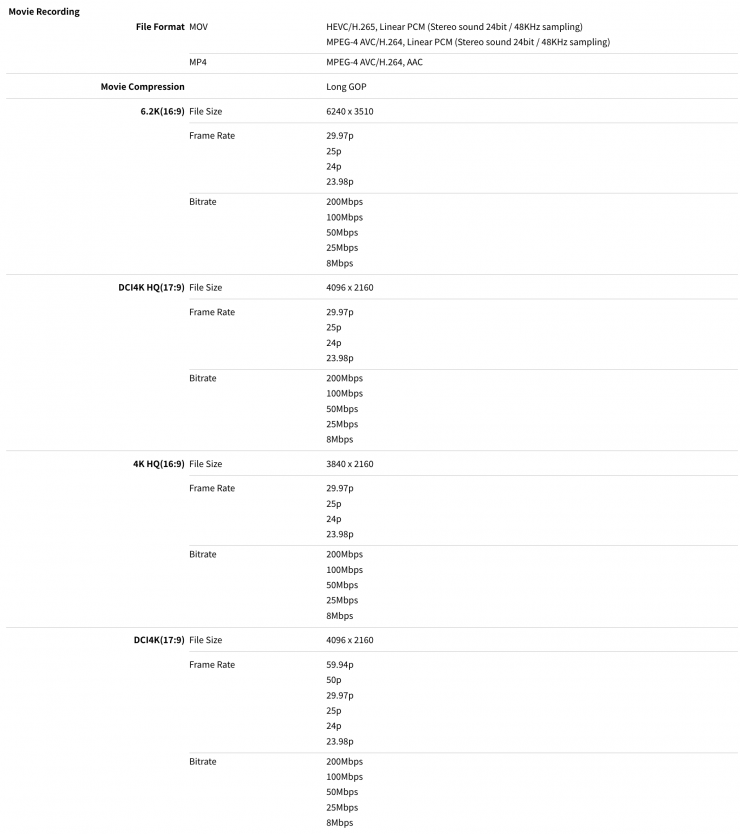 - 6.2K/30, 4K/60 and 1080p/240 fps Video