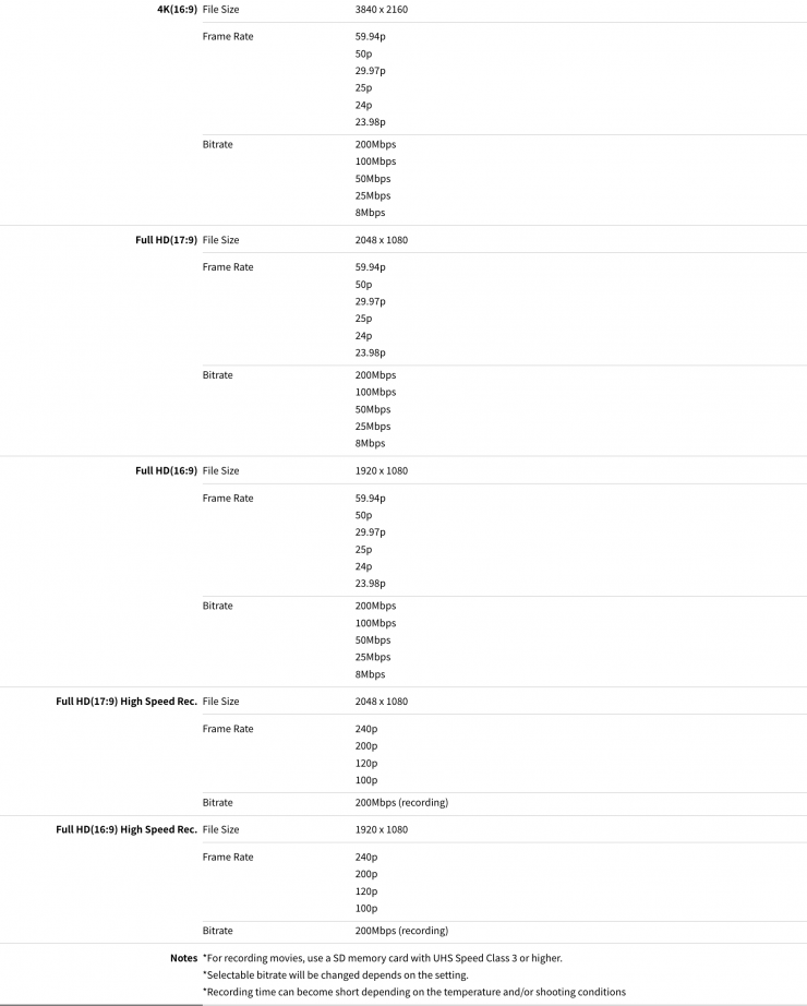 Above, you can see all of the resolutions, frame rates, codecs, etc. that are available. There are recording limits, but they will be dictated by the battery life.