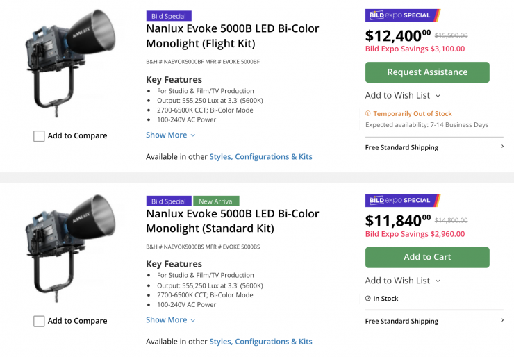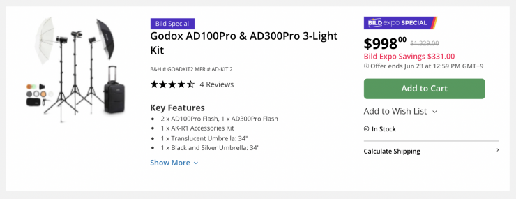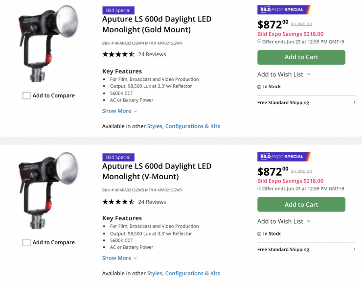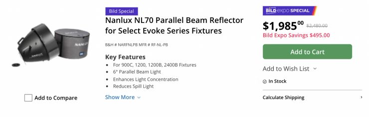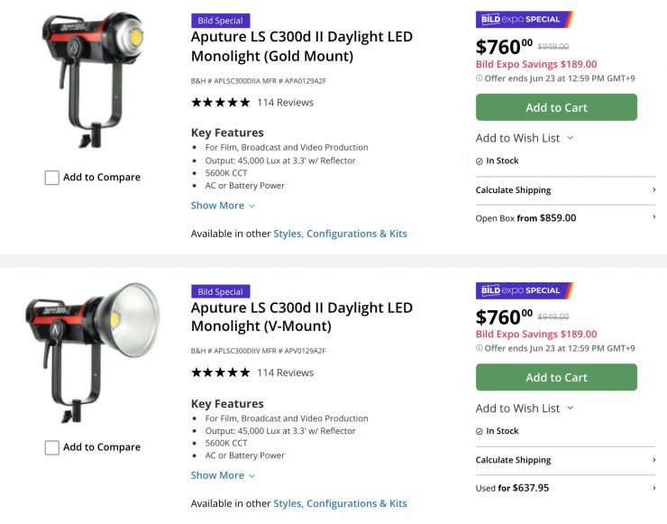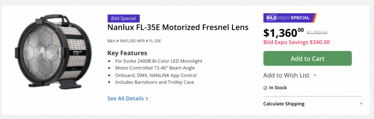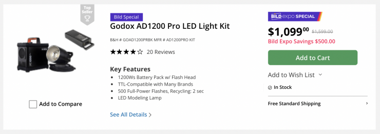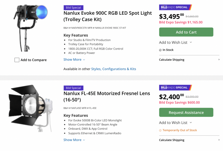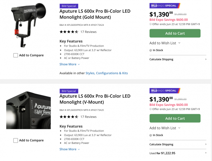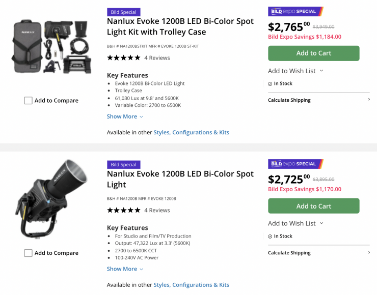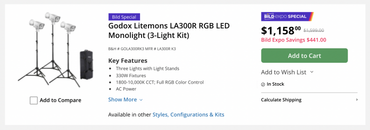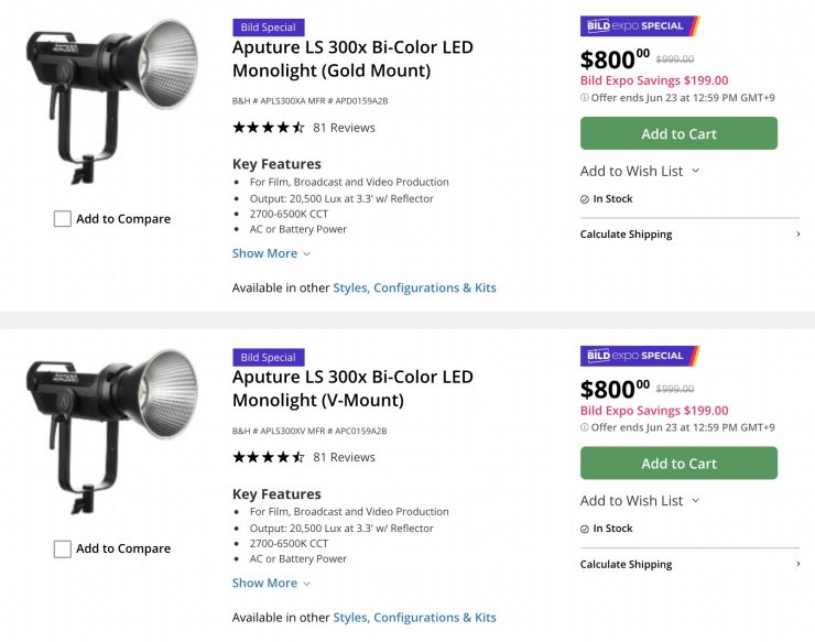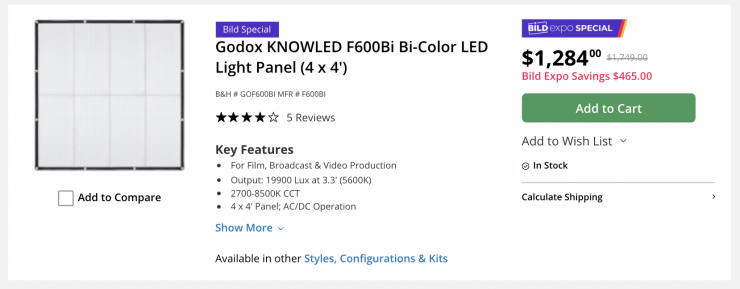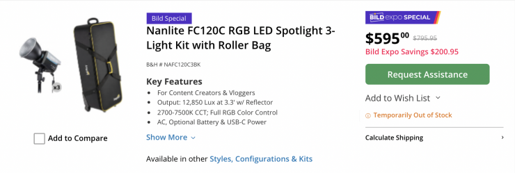 B&H has some good BILD Expo Lighting Specials that you may be interested in. There are deals from NANLUX, Nanlite, Aputure, and Godox. I have listed a few of them below.
