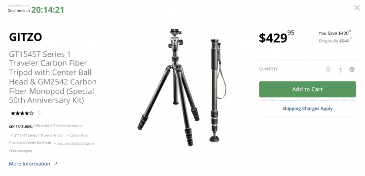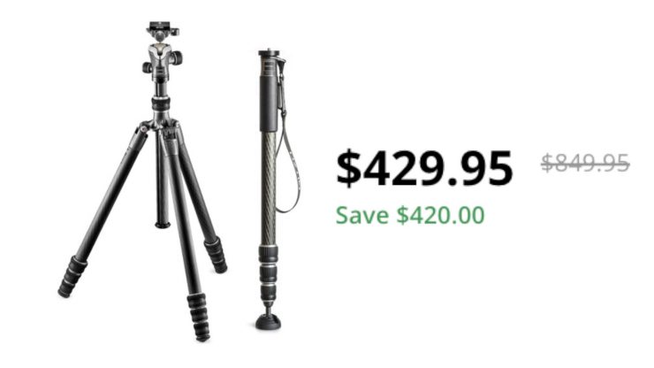 The Gitzo GT1545T Series 1 Traveler Carbon Fiber Tripod with Center Ball Head & GM2542 Carbon Fiber Monopod (Special 50th Anniversary Kit) is on sale for $429.95 USD, which is a discount of $420 USD.