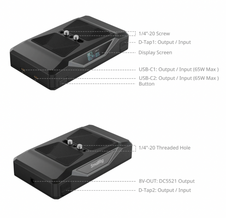 It features a portable, slim-profile design with a 73.8Wh capacity. SmallRig states that it utilizes Premium LG battery cells. The battery can be recharged in around 2 hours.