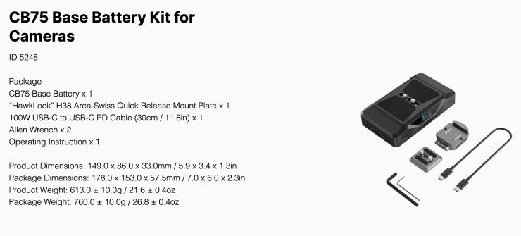 The SmallRig CB75 Camera Base Battery and Kit is $174.99 USD.