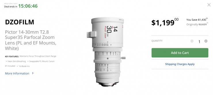 The DZOFilm Pictor 14-30mm T2.8 Super35 Parfocal Zoom Lens (PL and EF Mounts, White) is on sale for $1,199 USD, which is a big discount of $1,430 USD.