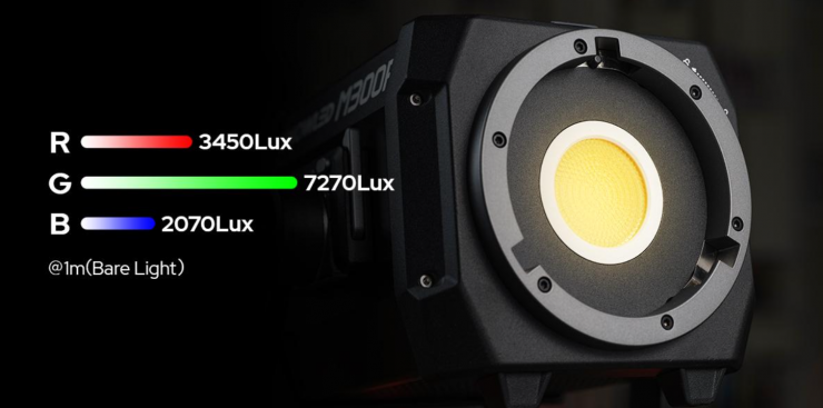 Measured at 1m / 3.3′ without modifiers, the RGB output levels are as follows: 3,450 lux for red, 7,270 lux for green, and 2,070 lux for blue. The fixture’s full-color output is claimed to fall within a performance range comparable to or above typical 600W-class LED lights.