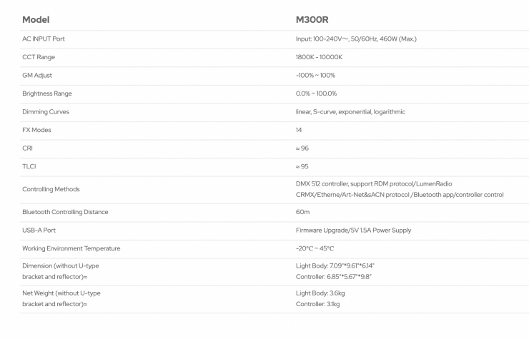 The M300R is equipped with an RGBWW LED chip-set, and it has a claimed