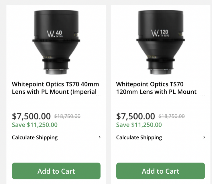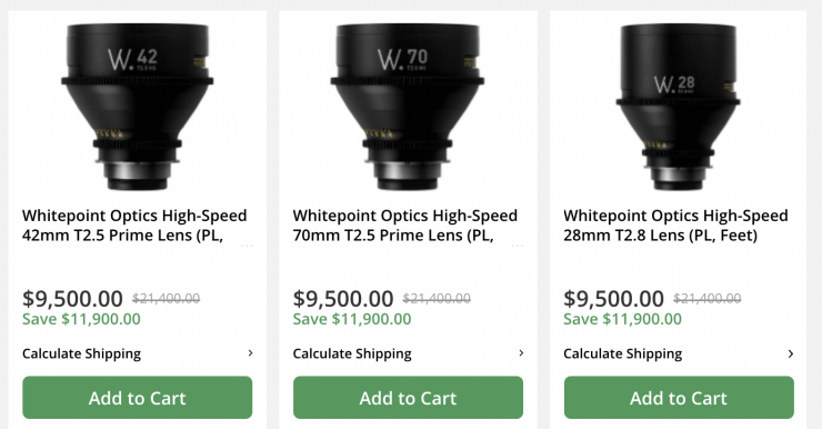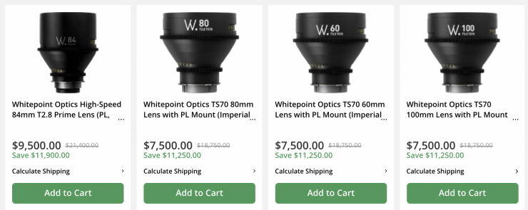 The Whitepoint Optics TS70 Primes are on sale for $7500-$9,500 USD, depending on the focal length, which is a massive discount of $11,250 USD.
