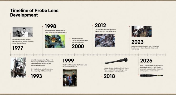 Probe lenses, as we know them today, have their roots in the early work of Paul Kenworthy, a Walt Disney Legend. In 1977, Kenworthy was the first to use the periscope lens in the film industry, allowing cameras to get incredibly close to miniature models and small objects. This innovation, which could capture detailed shots from tight spaces and unusual angles, laid the foundation for modern probe lenses. (Walt Disney, 2022)