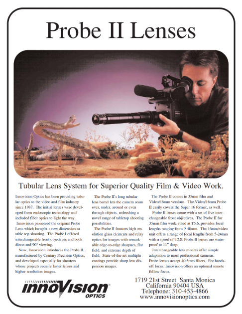 In the same year, Innovision launched the Probe I, which offered interchangeable objectives and 90° viewing. This, along with the later Probe II with T2.8, allowed cameras to maneuver through tight spaces and film shots once thought impossible, pushing the boundaries of filmmaking. (Cinetecnico, 2019)