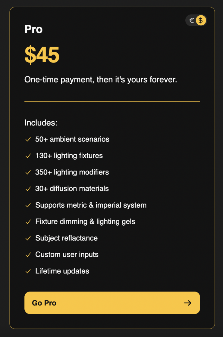 LightCalc is not subscription-based. It’s a one-time payment, and once purchased, the software is yours for life, including all future updates. It cost $45 USD.