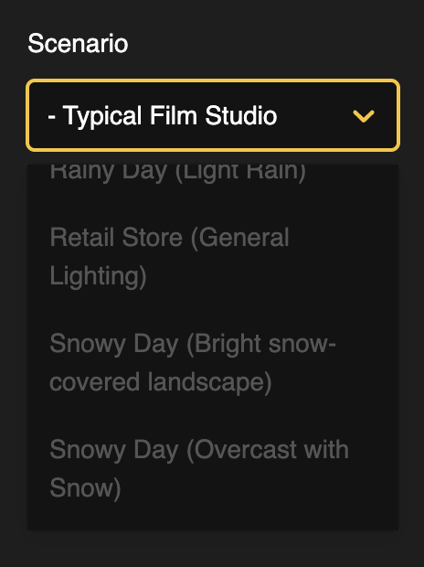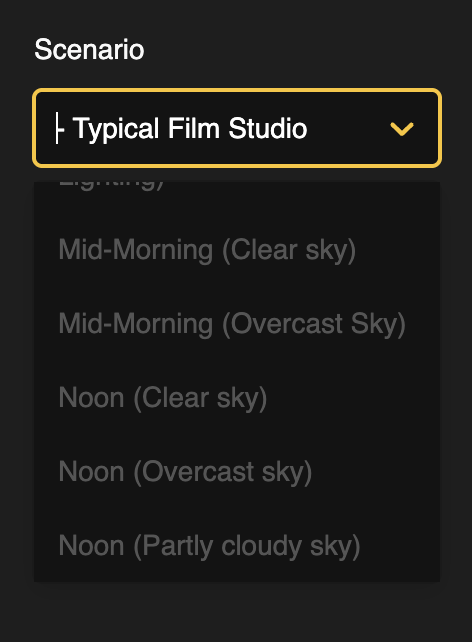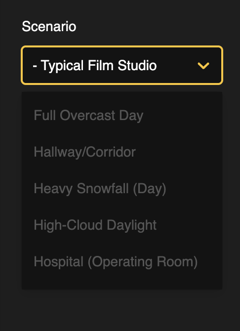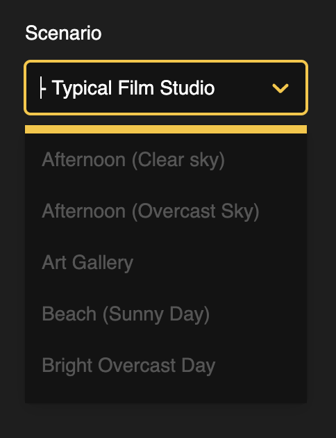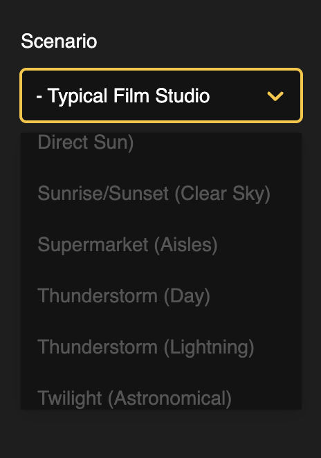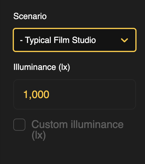 The app lets you choose from a very extensive selection of ambient lighting conditions, ranging from moonlight to office interiors. You first choose what ambient lighting condition you will be working in. All these environments have been measured by the developers of the apps.