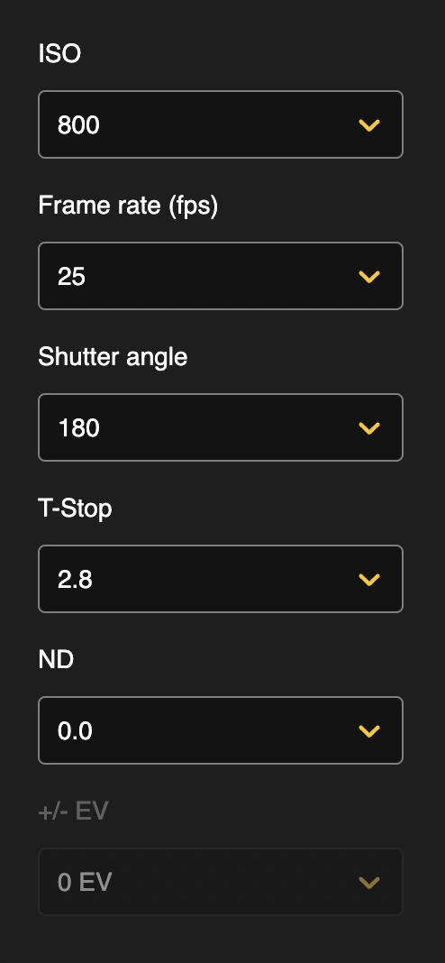 The next step is to dial in your camera settings, such as ISO, frame rate, T-stop, ND, shutter angle, etc.