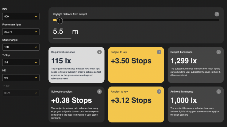 The app will then tell you, based on everything you have inputted, key information. In the example above, I have chosen to set the subject to ambient at +2.05 stops. This value indicates how many stops the subject is over- or underexposed compared to the base illuminance of the scene (ambient). This is often referred to as “lighting ratios”. A positive number (+) indicates that the subject appears brighter than, a negative number (-) indicates that the subject appears darker than the ambient in camera.