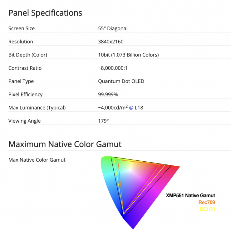 Flanders Scientific has announced its new XMP551 55″ UHD HDR/SDR reference mastering monitor with a 4th generation QD-OLED panel capable of up to 4000nit peak luminance, an 8,000,000:1 contrast ratio, and their widest color gamut ever.