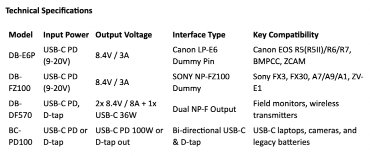 All the dummy battery models and the BC-PD100 converter feature USB-C Power Delivery input, supporting multiple voltage profiles (9V/12V/15V/20V) for broad compatibility with USB-C power banks, V-mount batteries, or adaptors. This ensures flexible and mobile powering options for field and studio workflows.