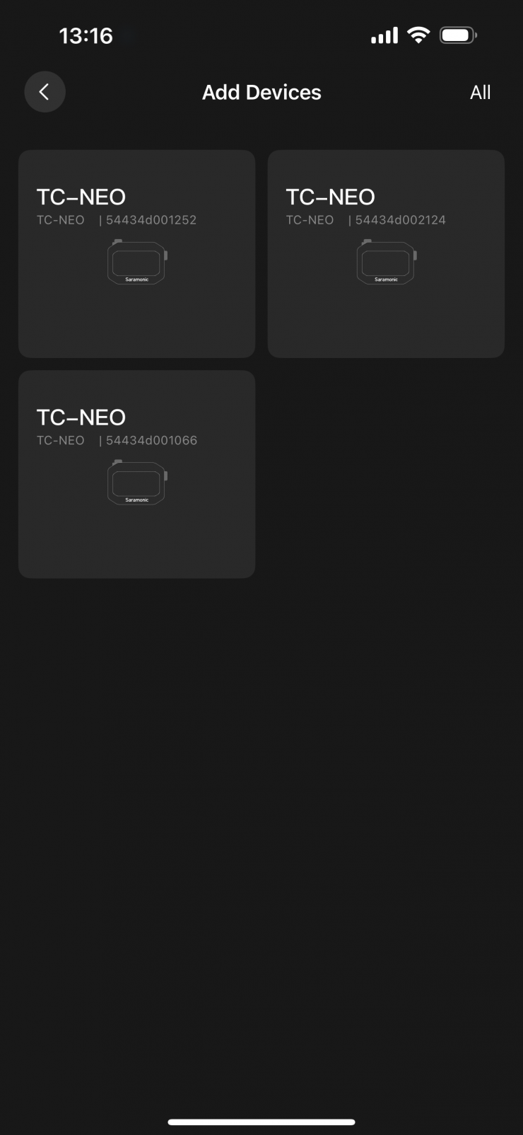 ① Launch the Saramonic System app on your mobile device, add all TC-NEO devices to the device list, and click “Confirm.”