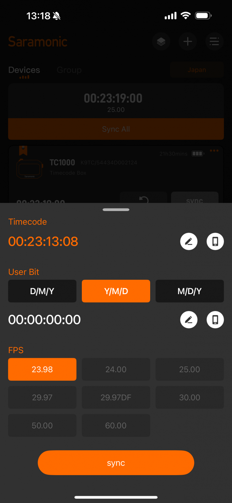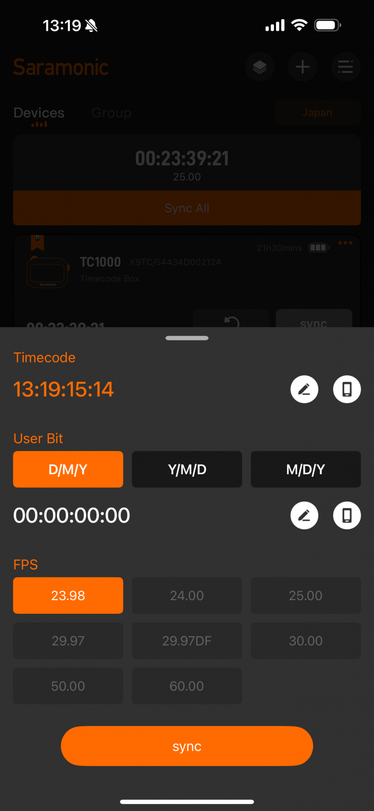 TC-NEO can wirelessly synchronize with other TC-NEO devices or Saramonic devices with timecode functionality without using the app.