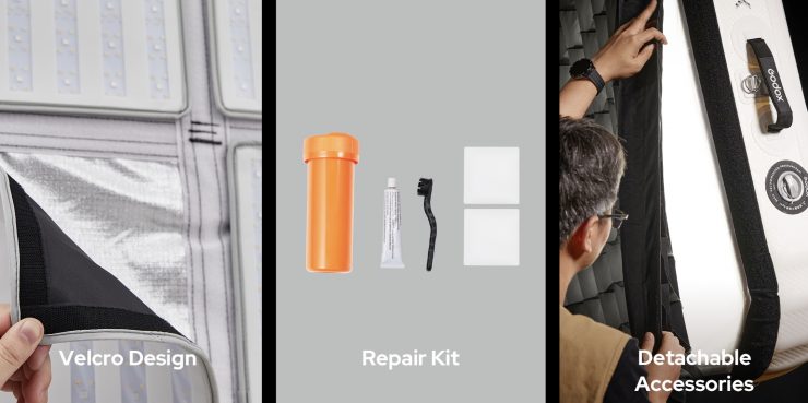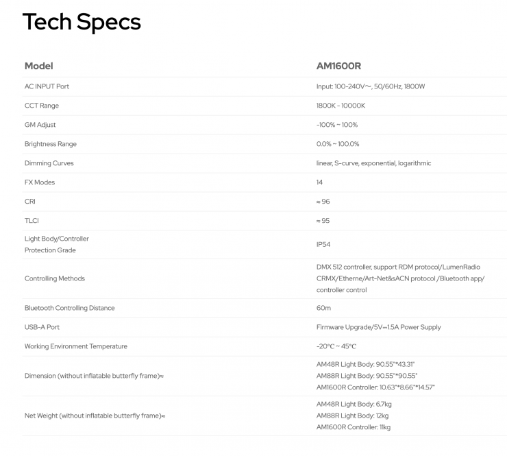The AM1600R’s Velcro-fastened modular design makes panel replacements easy, saving time and cutting costs on set. A repair kit is included to fix any leaks in the inflatable butterfly frame quickly. Accessories are also fully detachable for easy cleaning or replacement.