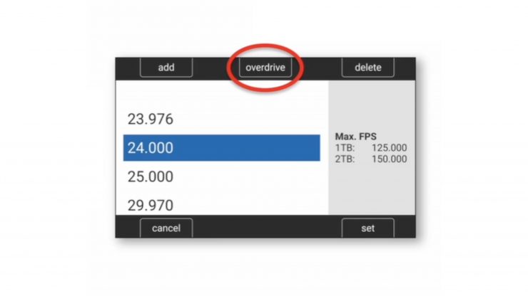 In Sensor Overdrive, the native ASA is 1600. You turn it on by going to the frames per second menu. Where you see the list of frames per second, there’s a new button called Overdrive. If you click that button, you get a notice that tells you all the trade-offs. Then, when you click confirm, it’ll show you in the home screen as well as on the SDI out.