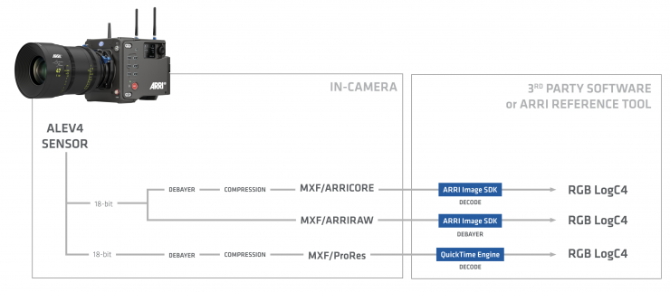 - 18 bit linear image data from the ALEV4 sensor stored in a RGB file in a logarithmic coding (called “Sensor Log” by ARRI)”