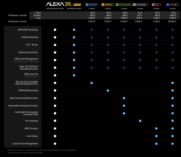 ARRI will be selling the ALEXA35 Xtreme in the same way they have been selling the ALEXA 35, in various sets. There will be camera sets, a premium set, and a base set. The base set can be upgraded with the same licenses that have been available for the ALEXA 35. ARRI is also keeping the prices for the camera sets and for the licenses exactly the same.