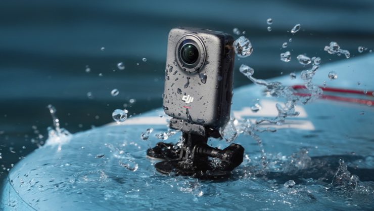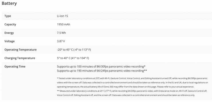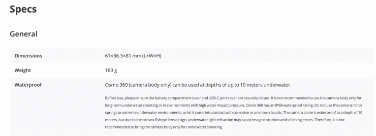 The Osmo 360 camera body features an IP68 waterproof rating and can be used at depths of up to 32.8′ underwater. It features a battery compartment cover and USB-C port cover to ensure waterproof operation for brief shots. The camera is also built to record up to 1.5 hours in extreme cold down to -4°F without a case.