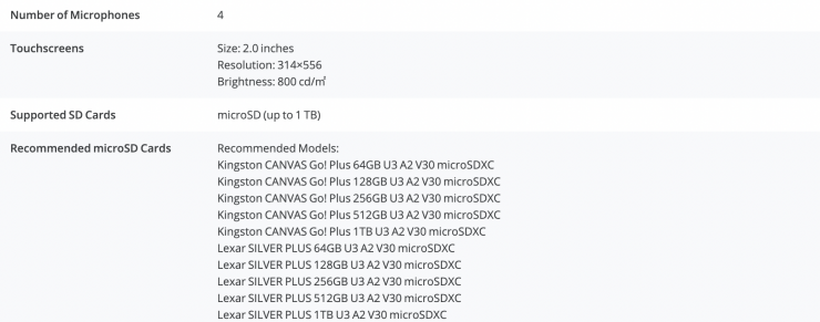 The camera provides 128GB of built-in storage to record video without an external card. Storage is expandable using the microSD slot, which allows you to utilize fast cards with up to 1TB capacity.