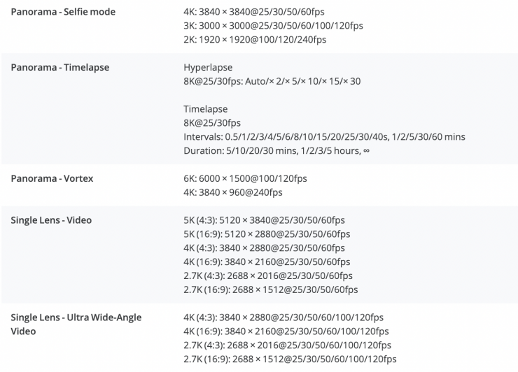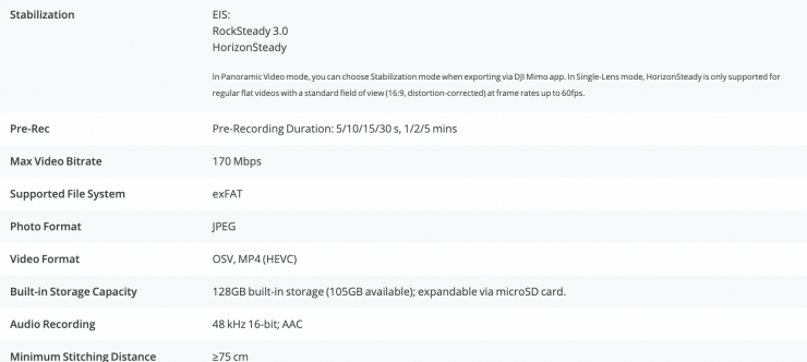 Both 360° and flat video modes support 10-bit color depth, and D-Log M mode is available to boost the dynamic range. These improvements offer greater flexibility for color grading in post-production.