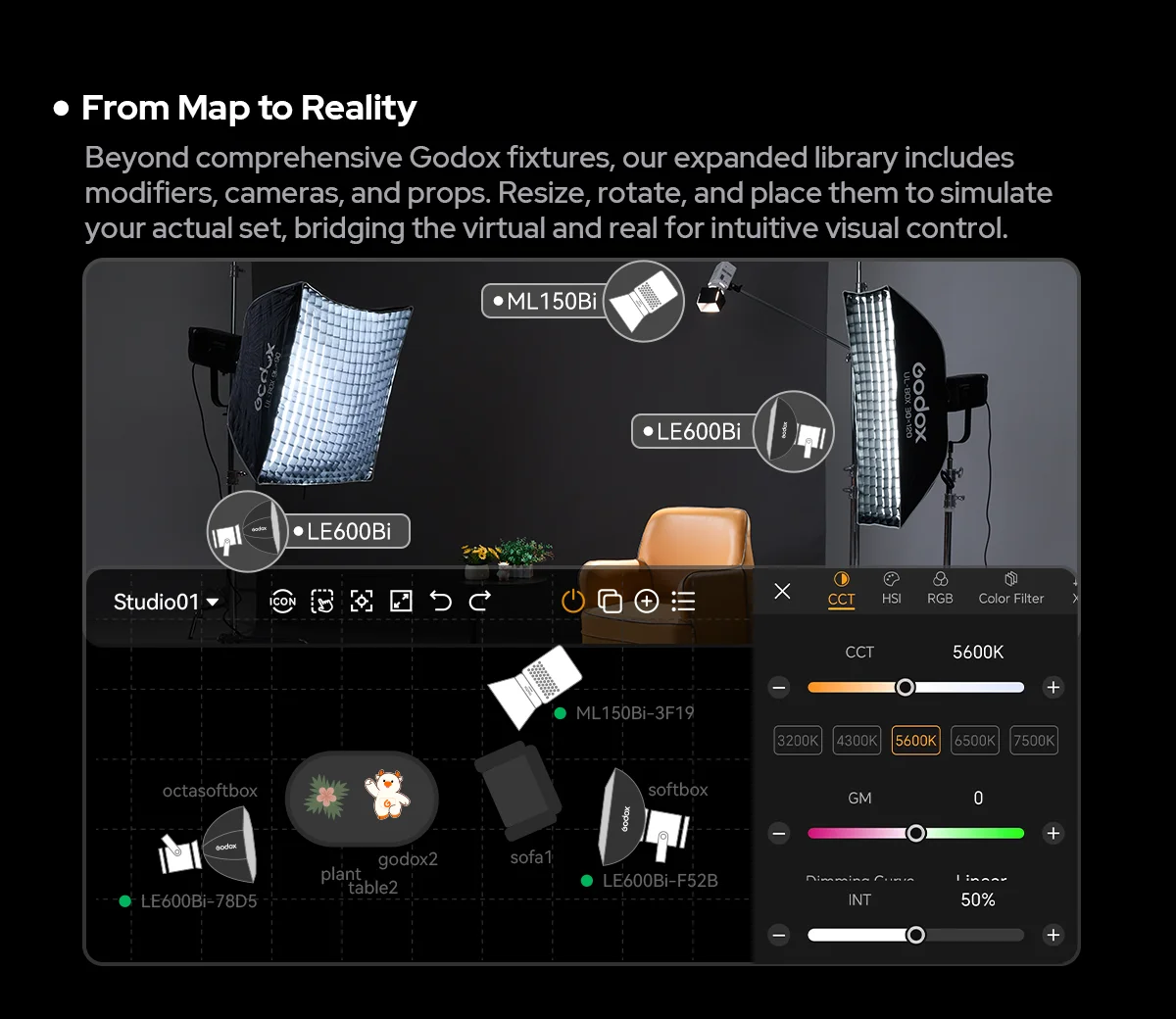 You can use tools including CCT, HSI, RGB, X/Y, and GELs, a Color Picker, and diverse FX modes.