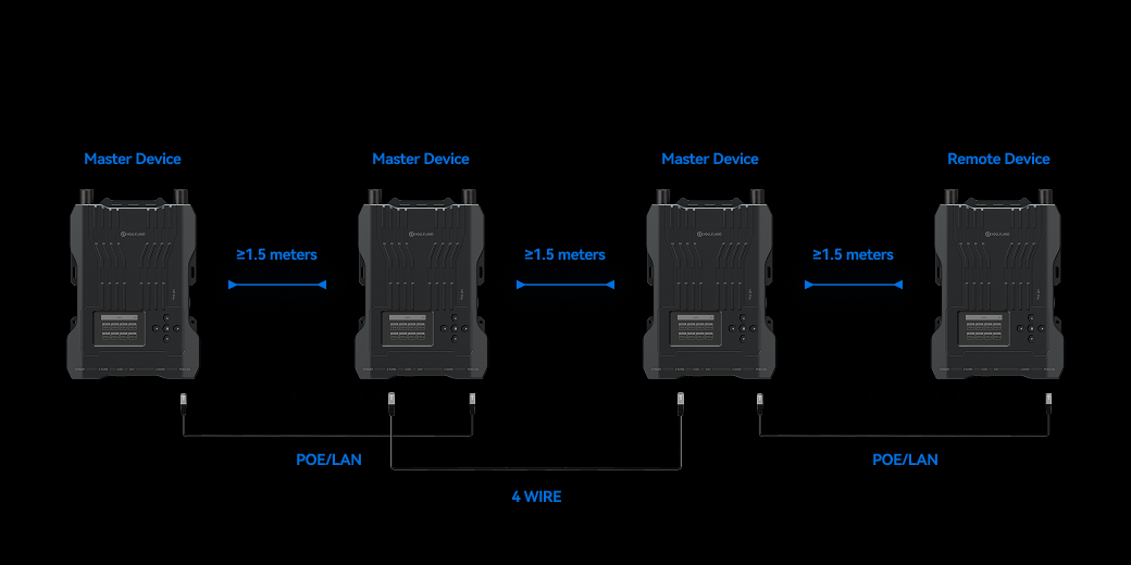 The Solidcom M1 Pro’s cascade connection capabilities mean that you can expand your system to include virtually unlimited base stations. To connect two Solidcom M1 Pro base stations, a straightforward option is to use either IP or a 4-wire cascade connection. To connect more than two base stations, a combination of IP and 4-wire cascade connections can be employed.
