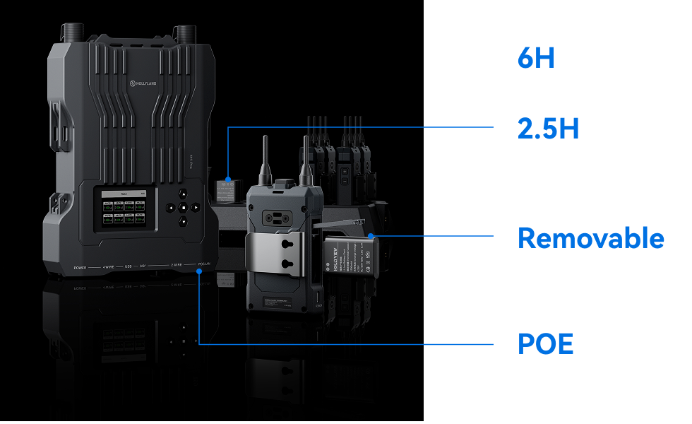 Each beltpack comes with two replaceable lithium polymer batteries with an operating time of up to 6 hours. The included charging base completely alleviates concerns about low power, as it can fully charge 8 beltpacks and 8 batteries in merely 2.5 hours at a time. The base station supports power supply through POE or NP-F batteries.
