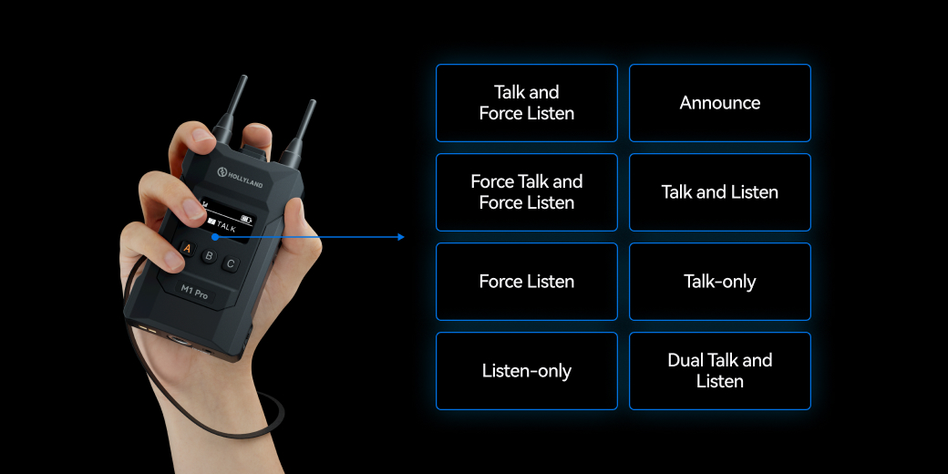 The Solidcom M1 Pro allows for up to three-group communication, even in unlimited cascade connections. Group configuration flexibility is easily accessible via the base station or web page (where the group configuration file can be saved and imported). The beltpack offers 8 preset modes that users can adjust to suit their individual working needs. These modes are ideal for different team collaboration scenarios and work situations. Each mode comes with a color indicator light to make it easy to use and understand.